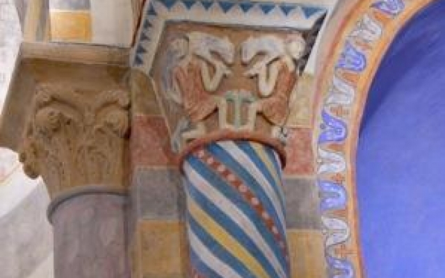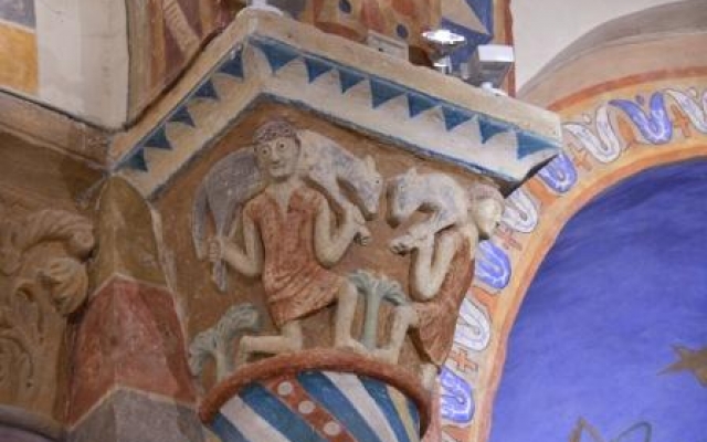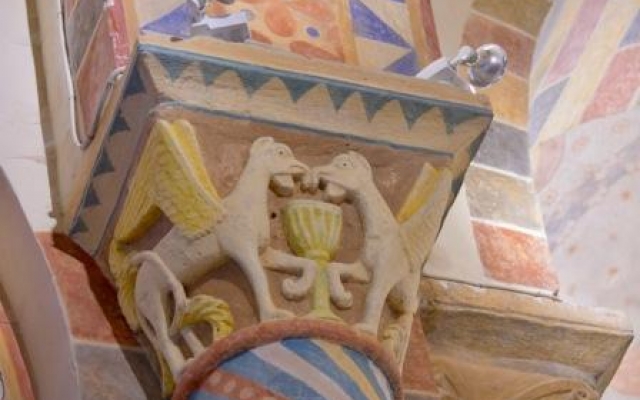 – Chapiteaux XIIème siècle. caractéristiques de l’art roman de cette époque, consacrés à l’instruction des fidèles et ayant plusieurs symboles : immortalité (chapiteau corinthien décoré de feuilles d’acanthe), partage et communion eucharistique (chapiteau montrant deux griffons – lion ailé à tête d’aigle – buvant dans une coupe, condition humaine (chapiteau avec 2 porteurs de moutons) ou encore la luxure (hommes chevauchant un bouc). (voir diaporama en fin d’article).
